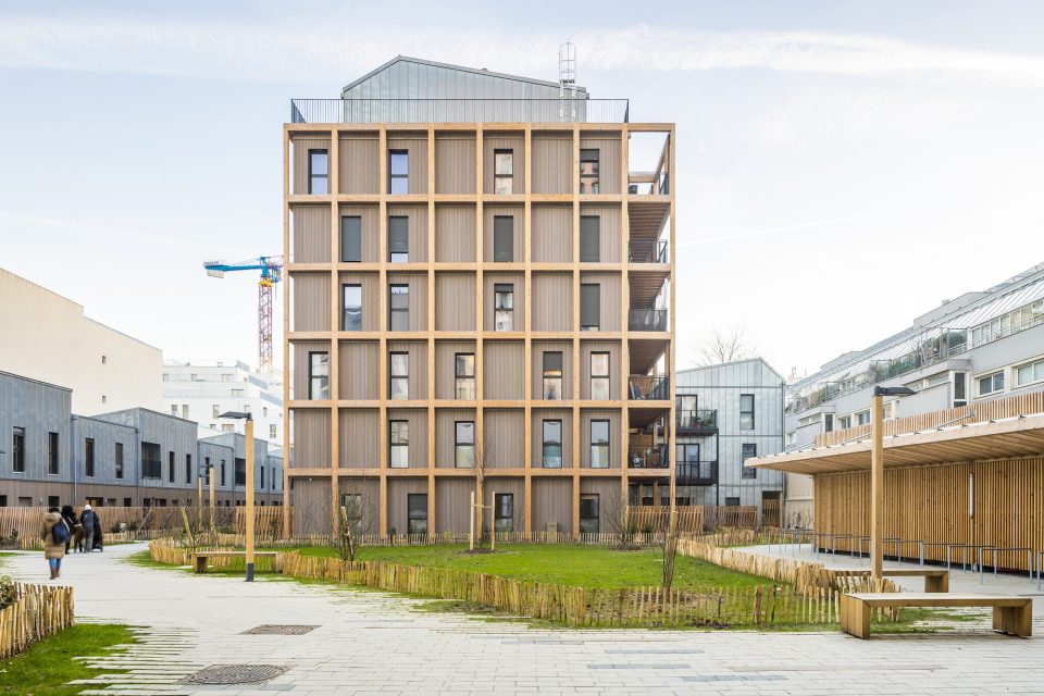 Text description provided by the architects. Located on a plot of land in the heart of the block occupied by an 8 stories car park, the project comprises two operations of 75 housing units for sale and 74 social housing units. The project proposes to engage the project’s actors, as well as the inhabitants, in the steps of a rational, visionary, and sustainable approach to urban transformation. The social housing building is built in a wooden structure, while the building for homeownership is built by preserving and adapting the concrete structure of the existing car park. Through their respective specificities, the two projects meet the overall challenge set.