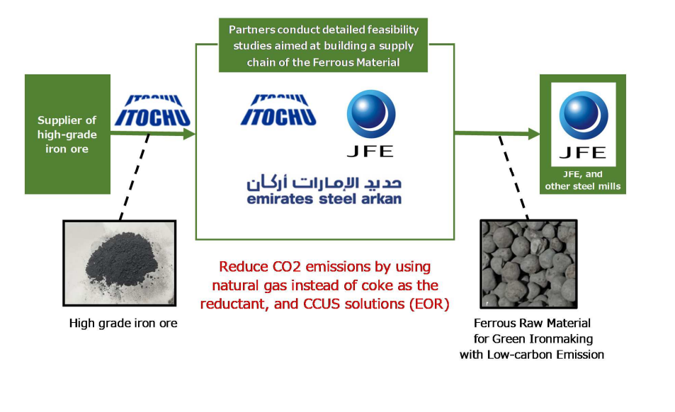 JFE Steel Corporation announced that it has agreed with Itochu Corporation and Emirates Steel Arkan, the largest steel company in the lnited Arab Emirates (lAE), to jointly conduct detailed feasibility studies on the establishment of a supply chain of the Ferrous Raw Material for Green Ironmaking with Low-carbon Emission, hereinafter “the Ferrous Material”, at the project site in Abu Dhabi.