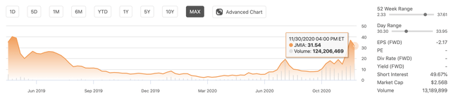 It has been a bumpy ride since the company’s IPO back in April 2019 when the IPO was priced at $14.50 and closed up 75% on its public deput, just to see its stock crash down all the way to the $2 range in the following 12 months. While there were multiple reasons for that crash, including disappointing quarterly results, discontinuations of operations in some countries, and a destructive short-seller report from Citron, Jumia’s stock price has recovered in an astonishing fashion since hitting its all-time lows at $2.33 per share during on March 16th 2020.