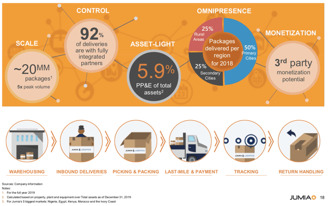 Jumia is the only fully integrated operator of e-commerce in Africa. While there at multiple players in different parts of commerce (e.g. Zando in South Africa) or fintech (Flutterwave, Paystack, Interswitch, O-Pay a.o.) there is no company that operates as a fully integrated services offerings platform across multiple countries. I see infrastructure as a major barrier to broad e-commerce adoption. I believe that Jumia’s logistics offerings will be a key differentiator and barrier to entry for competitors as it is hard to replicate that from scratch. Jumia’s logistics & fulfillment offerings are already well established and active in all major operating areas with an extensive network of fully integrated partners across the continent. Jumia already handled ~20MM packages for FY 2019 and 92% of deliveries are with fully integrated partners. Management says that Jumia logistics is asset-light and only accounted for 5.9% of property, plant and equipment of total assets as of Dec 31, 2019. During Q3 2020, Gross profit after Fulfillment expense reached positive €6.6 million, demonstrating continued unit economics improvements driven by its asset-light logistics offerings.