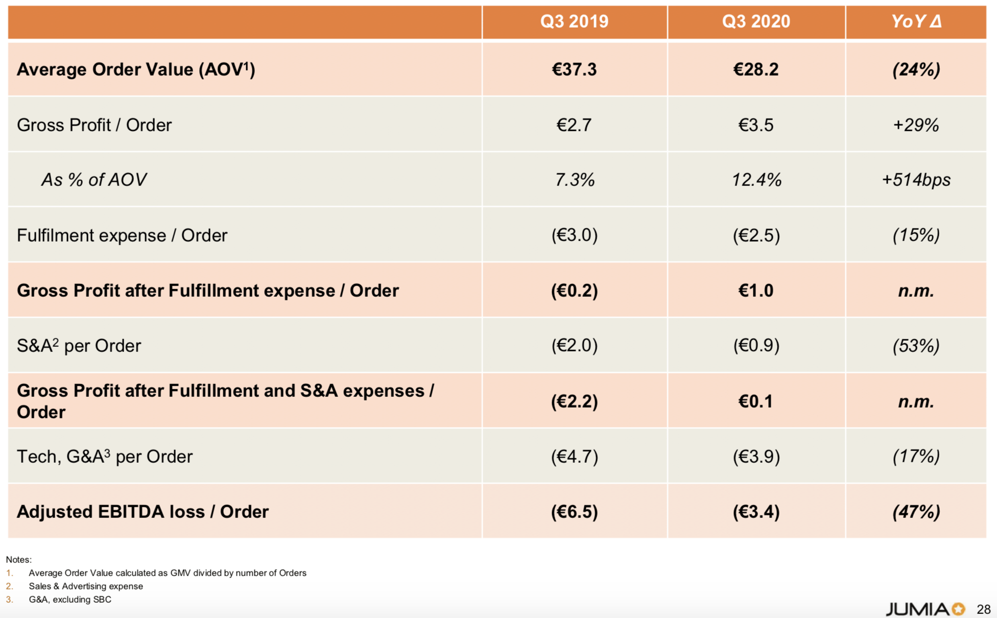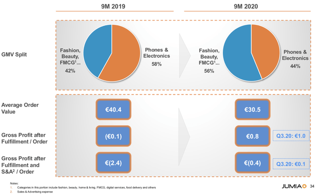 While overall GMV, revenue, and order numbers were largely disappointing, these current figures need to be interpreted with caution as they are impacted by the business mix shift towards lower cost, higher frequency purchase, everyday product categories, as well as enhanced promotional and expense discipline. Current comparisons are against higher lifetime value, more expensive goods such as phones / electronics which had a significantly larger share of the company’s GMV in the past quarters. Jumia reported a reduction in GMV share from phones & electronics down from 56% in Q3 2019 to 43% in Q3 2020 GMV. The business mix rebalancing efforts led to a 24% decrease in average order value from €37.3 in Q3 2019 to €28.2 in Q3 2020, affecting overall GMV and revenue performance. Meanwhile gross profit margin inched up by +514bps YoY (see here).