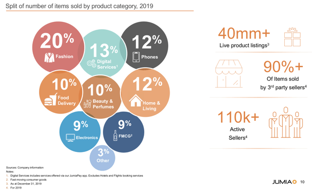 The company earns money from commissions on items sold on its e-commerce platform from 3rd party sellers, while also offering full handling of the logistics, including warehousing and fulfillment, deliveries, tracking, return handling and payments offerings. Buyers can use Jumia’s platform to buy good and services from all kinds, including everyday products like cosmetics & hygiene, fashion, electronics, and even food delivery. The most recent split of goods sold on its platform is shown below.