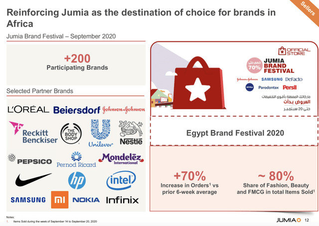 Jumia has already demonstrated that it can scale up order volumes quite easily. After launching their first ever Jumia Brand Festival the company reported a +70% increase in orders vs. the prior 6-week average. Roughly 80% of the items sold were from the targeted fashion, beauty and FMCG category that management is pivoting its business mix rebalancing efforts towards.
