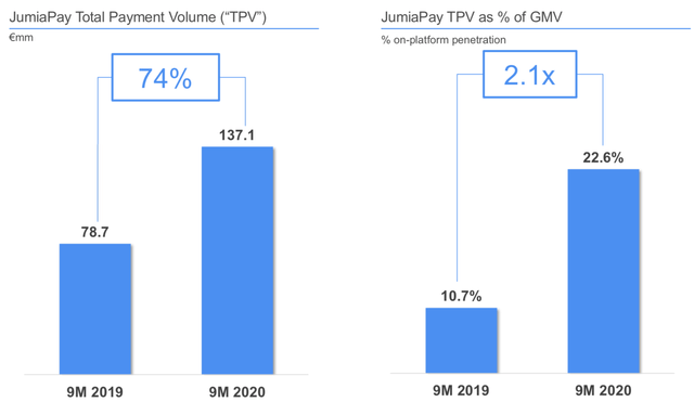 JumiaPay already has a large existing customer base and growth of JumiaPay has been one of the highlights during the past quarters: during the 9 months of 2020 JumiaPay TPV grew by 74% to €137 million and JumiaPay TPV as a % of GMV reached 22.6% (more than twice the number compared to the first 9 months of 2019).