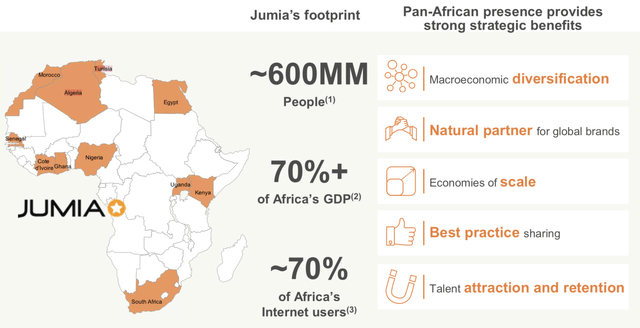Jumia is the leading e-commerce operator with a Pan-African presence across 11 countries that together have a population of 600 million people, which accounts for >70% of Africa’s GDP of €2 trillion and almost 70% of Africa’s internet users.