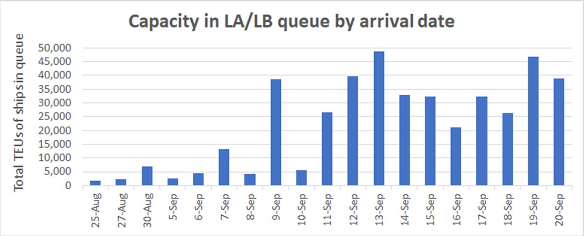 Thirty-six ships with a total capacity of 230,803 TEUs arrived in port waters in the seven days through Monday. That’s 54% of the total TEU capacity waiting offshore. Another 27 ships with total capacity of 176,892 TEUs arrived between one and two weeks prior to Monday, representing a further 42%. The remaining few ships arrived in late August and early September.