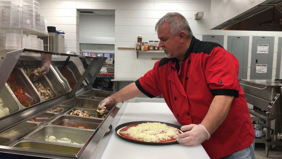 On this day, inside the school kitchen, he sprinkles toppings on a popular item. They make anywhere from 60 to 70 pizzas a day.