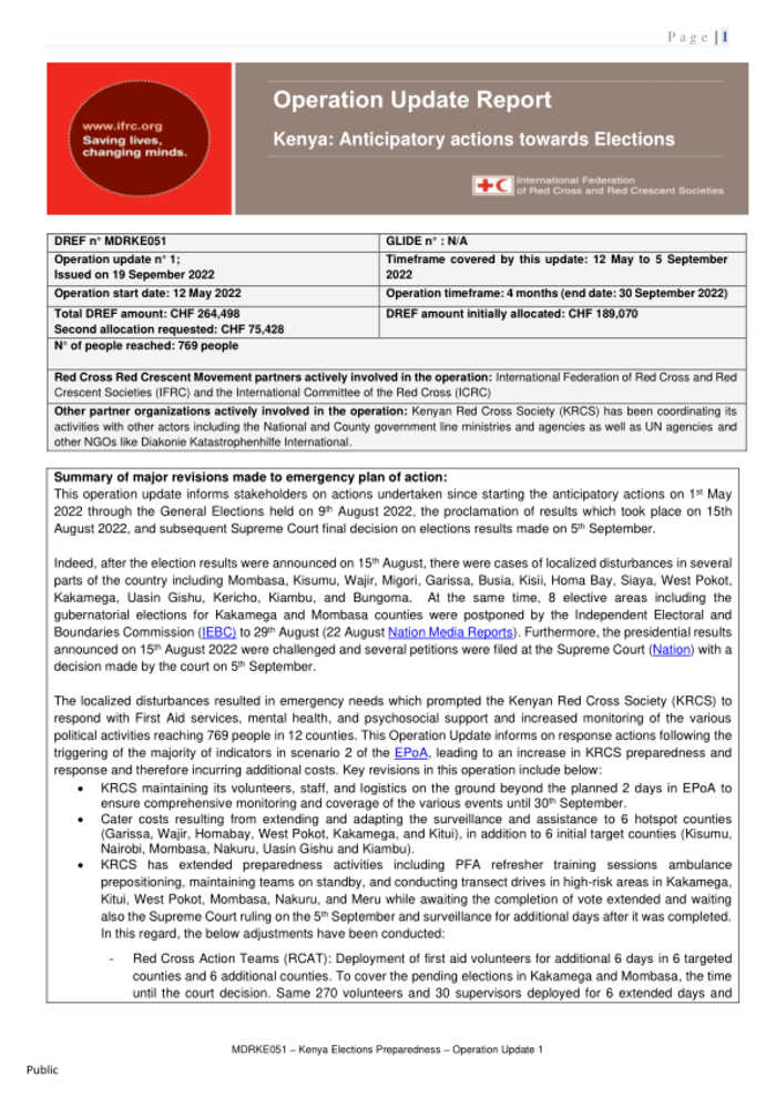 The localized disturbances resulted in emergency needs which prompted the Kenyan Red Cross Society (KRCS) to respond with First Aid services, mental health, and psychosocial support and increased monitoring of the various political activities reaching 769 people in 12 counties. This Operation Update informs on response actions following the triggering of the majority of indicators in scenario 2 of the EPoA, leading to an increase in KRCS preparedness and response and therefore incurring additional costs. Key revisions in this operation include below: