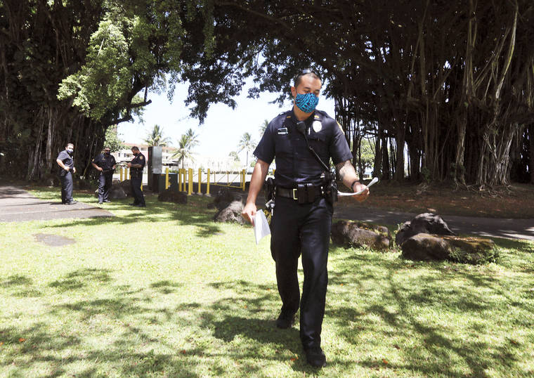 With restrictions to beach and shoreline parks extending until late this month, Hawaii County police are distributing handouts at parks across the island that explain what visitors can and can’t do.