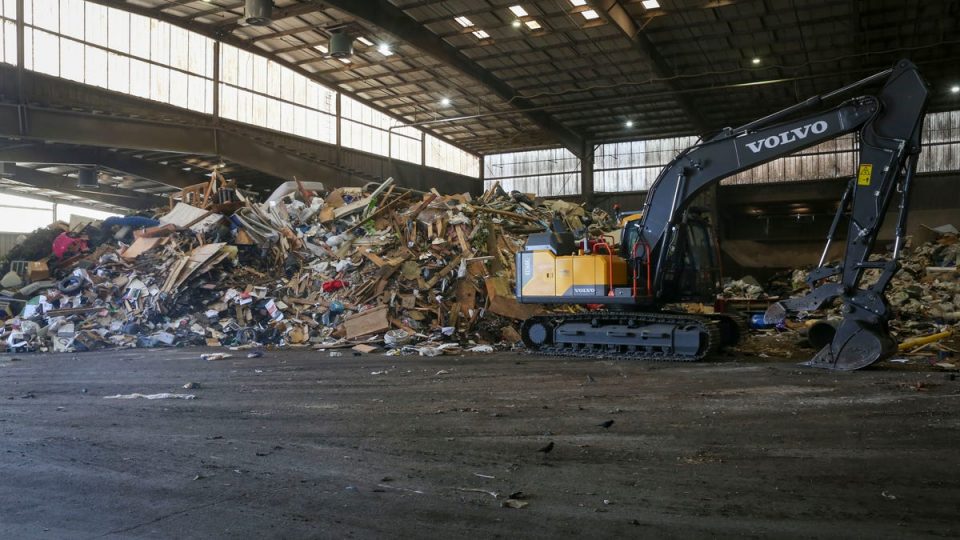 With the compactor broken, transfer center employees are dropping the accumulated trash through a hole in the facility floor by excavators, where it drops into shipping containers that are taken away by semi-trucks. The process moves about a third of the material of the normal routine.
