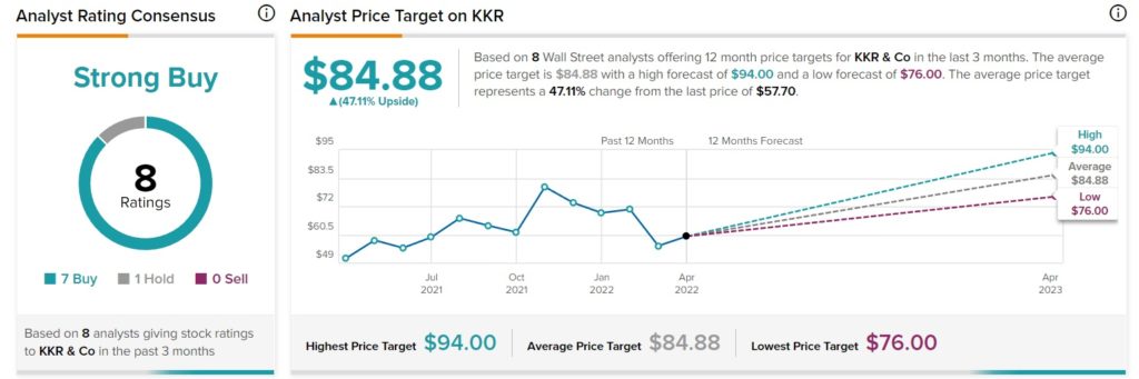 Consensus among analysts is a Strong Buy based on seven Buys and one Hold. KKR’s average price target of $84.88 implies upside potential of 47.1% from current levels. Shares have gained 10.9% over the past year.