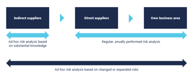 In addition, all risks along the entire supply chain (i.e. own organisation, direct and indirect suppliers) are subject to an ad-hoc assessment in case such risks have changed significantly or have emerged due to new circumstances. Such an ad-hoc risk analysis may be prompted by a change in business activity like entering a new procurement country.