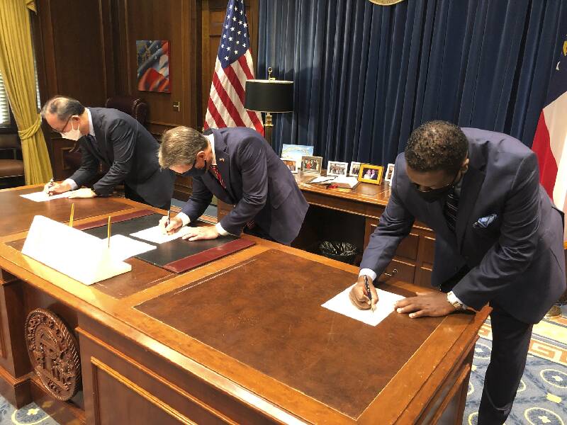Zinus USA President Ha Bong Sung, Georgia Gov. Brian Kemp and Henry County Development Authority Chairman Pierre Clements sign papers on Tuesday, August 18, 2020 at the state Capitol in Atlanta. Zinus, a South Korean mattress and furniture maker, plans to build a $108 million factory and distribution center in McDonough, south of Atlanta. (AP Photo/Jeff Amy)