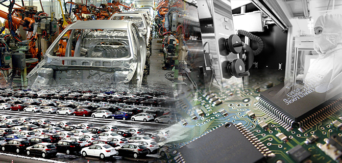 Semiconductor output rose 9.3 percent while automobiles dropped 7.5 percent and metal processing fell 6.5 percent.