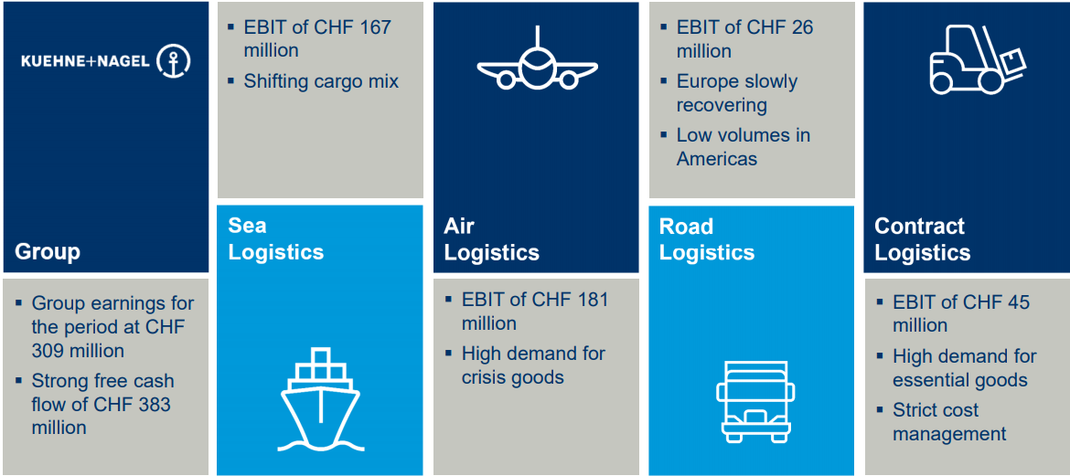 Kuehne + Nagel breaks down its logistics business across four segments: ocean, air, road and contract.