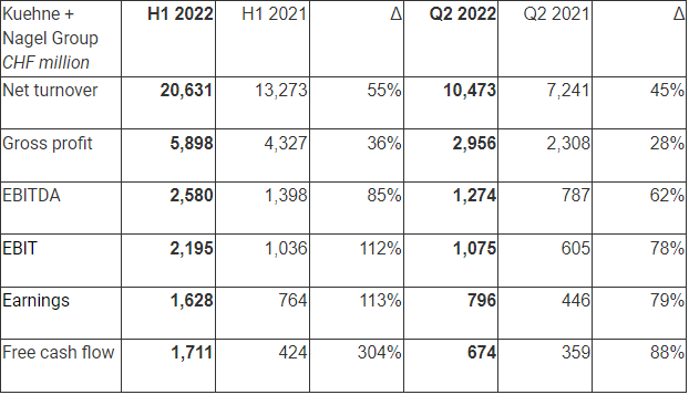 Elevated yields continued to exceed exceptionally high freight transportation and warehousing costs, pushing up revenue 45% to 10.4 billion Swiss francs ($10.9 billion) and operating profit 78% to $1.1 billion versus the 2021 June quarter, Kuehne + Nagel (OTCUS: KHNGY) said Monday. Quarterly and first-half revenue was nearly double the same periods prior to the pandemic, and pretax income quadrupled from 2019, even as freight volumes eased from a year ago.