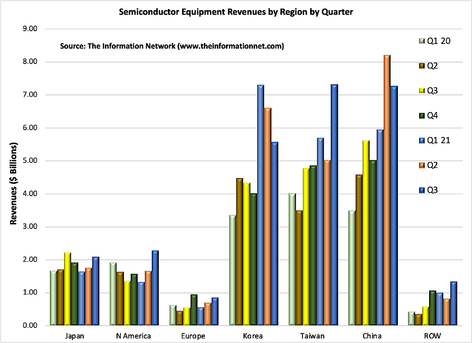 In 2020, China held the largest market for semiconductor equipment purchases, growing 39% to $18.72 billion. In the first three quarters of 2021, China was again the largest market for equipment, representing 24% of total equipment sales. Chart 1 shows QoQ growth of equipment sales to China from Q1 2020 through Q3 2021.