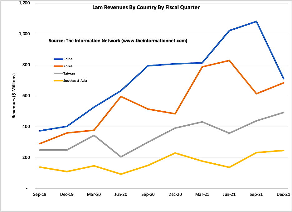 Chart 2 shows Lam’s revenue by country between September 2019 and December 2021. China represented its greatest source of revenue during this period, although the drop in Q4 2021 is significant.