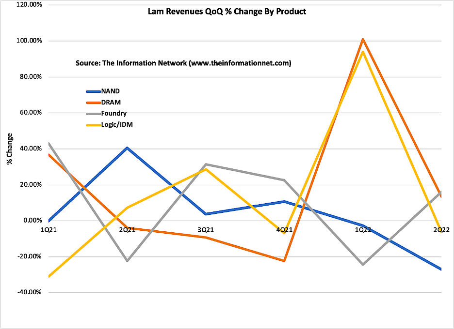 While Lam’s CEO expounded on excuses for the poor quarter, which missed by $188 million, he neglected to point out that revenues for the quarter were coming off an abnormally strong quarter due to unsustainable pull-ins of equipment by DRAM and Logic/IDM customers, as shown in Chart 4.