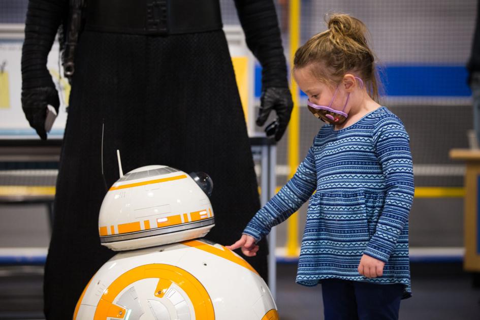 Michael Shoff, 8, of Lancaster, is issued an Imperial citation by officer Juno Eclipse for being part of the Rebel Alliance after Kylo Ren pointed out his shirt, while his siblings Meredith, 10, and Daniel, 5, and his mother Amanda Shoff watch at the Lancaster Science Factory’s sixth-annual Star Wars event in Lancaster, Pa., on Nov. 15, 2020. Amanda said this was one of the few events where they felt safe enough to attend, due to the 30% reduced capacity.