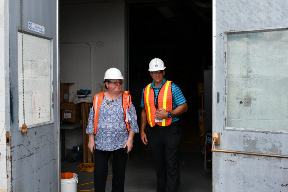 The Los Alamos Reporter and former Department of Energy Environmental Management Los Alamos Field Office Manager Doug Hintze exit Building 257 in TA-21 in August 2019. Courtesy photo