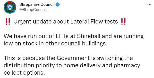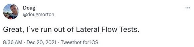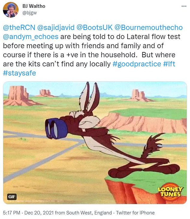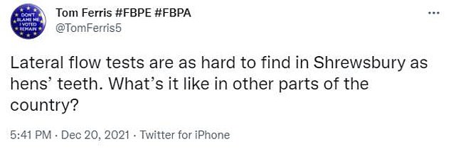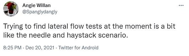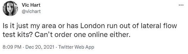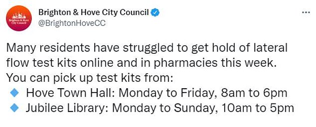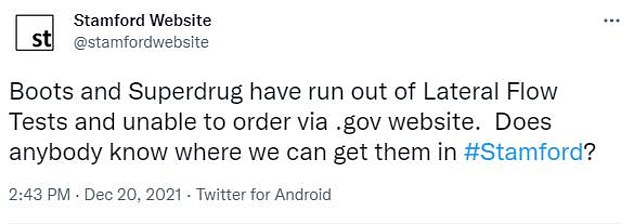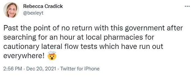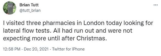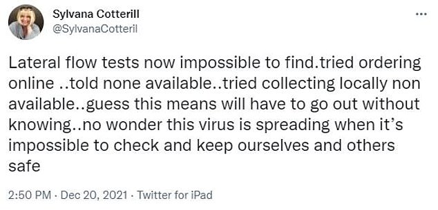 More than 11million test kits were sent out to pharmacies last week – double the number in the previous week – but this was not enough as many Britons are taking to social media to complain they still cannot not find a pack anywhere locally.