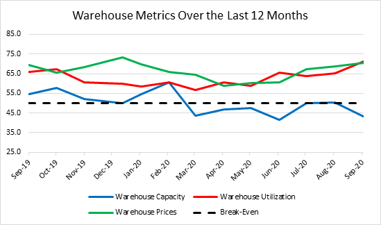 The warehousing utilization index registered 71.1% in September 2020. This represents a modest 5.9 percentage point increase from last month, and is up by 5.3 percentage points from the September 2019 reading of 65.8. This sharp increase in the rate at which utilization is increasing is congruent with the decrease in capacity noted previously. Previously in this report, the team noted that the reasoning for the growth in utilization was being driven by “1. The increased re-opening of the economy driving the need for fulfillment/storage of products; and 2. The increased reliance on and shift to e-commerce. In addition, as schools and universities re-open the corresponding supply chains that support them are likely relying on the logistics system to support this operation.” It appears that these were accurate, and now the driving force behind the increase is also being fueled by the expected size of the holiday shopping season.