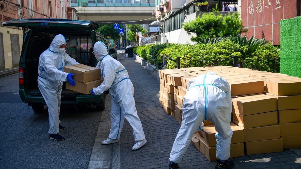 Staff members of China Post unload parcels of daily necessities for residents quarantined at home from a minivan on May 14, 2022 in Shanghai, China.