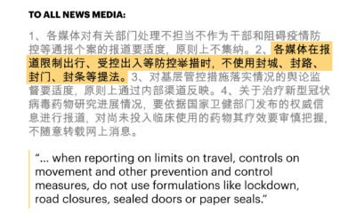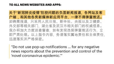 Headlines should steer clear of the words “incurable” and “fatal,” one directive said, “to avoid causing societal panic.” When covering restrictions on movement and travel, the word “lockdown” should not be used, said another. Multiple directives emphasized that “negative” news about the virus was not to be promoted.