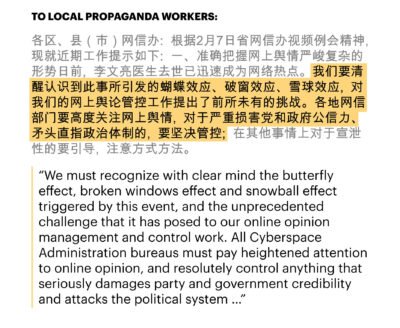 Yet China’s censors decided to double down. Warning of the “unprecedented challenge” Li’s passing had posed and the “butterfly effect” it may have set off, officials got to work suppressing the inconvenient news and reclaiming the narrative, according to confidential directives sent to local propaganda workers and news outlets.