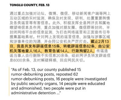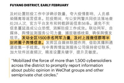 Officials in one district reported that workers in their employ had posted online comments that were read more than 40,000 times, “effectively eliminating city residents’ panic.” Workers in another county boasted of their “severe crackdown” on what they called rumors: 16 people had been investigated by the police, 14 given warnings and two detained. One district said it had 1,500 “cybersoldiers” monitoring closed chat groups on WeChat, the popular social app.