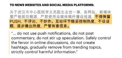 Headlines should steer clear of the words “incurable” and “fatal,” one directive said, “to avoid causing societal panic.” When covering restrictions on movement and travel, the word “lockdown” should not be used, said another. Multiple directives emphasized that “negative” news about the virus was not to be promoted.