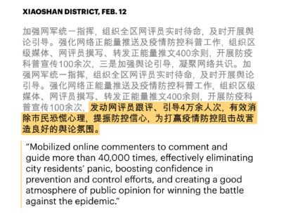 Officials in one district reported that workers in their employ had posted online comments that were read more than 40,000 times, “effectively eliminating city residents’ panic.” Workers in another county boasted of their “severe crackdown” on what they called rumors: 16 people had been investigated by the police, 14 given warnings and two detained. One district said it had 1,500 “cybersoldiers” monitoring closed chat groups on WeChat, the popular social app.