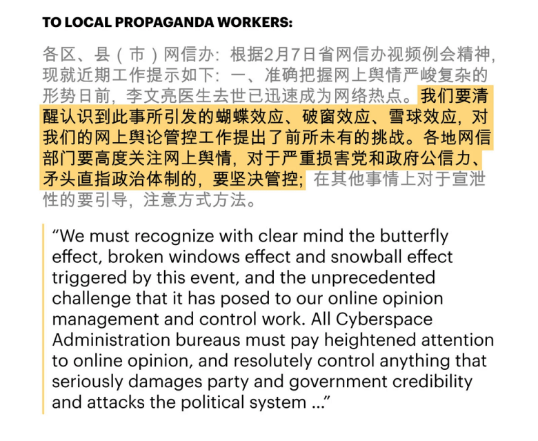 Yet China’s censors decided to double down. Warning of the “unprecedented challenge” Li’s passing had posed and the “butterfly effect” it may have set off, officials got to work suppressing the inconvenient news and reclaiming the narrative, according to confidential directives sent to local propaganda workers and news outlets.
