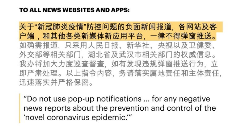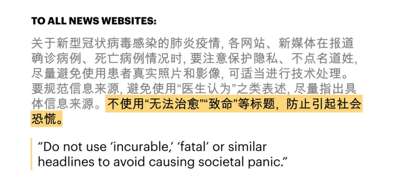 Headlines should steer clear of the words “incurable” and “fatal,” one directive said, “to avoid causing societal panic.” When covering restrictions on movement and travel, the word “lockdown” should not be used, said another. Multiple directives emphasized that “negative” news about the virus was not to be promoted.