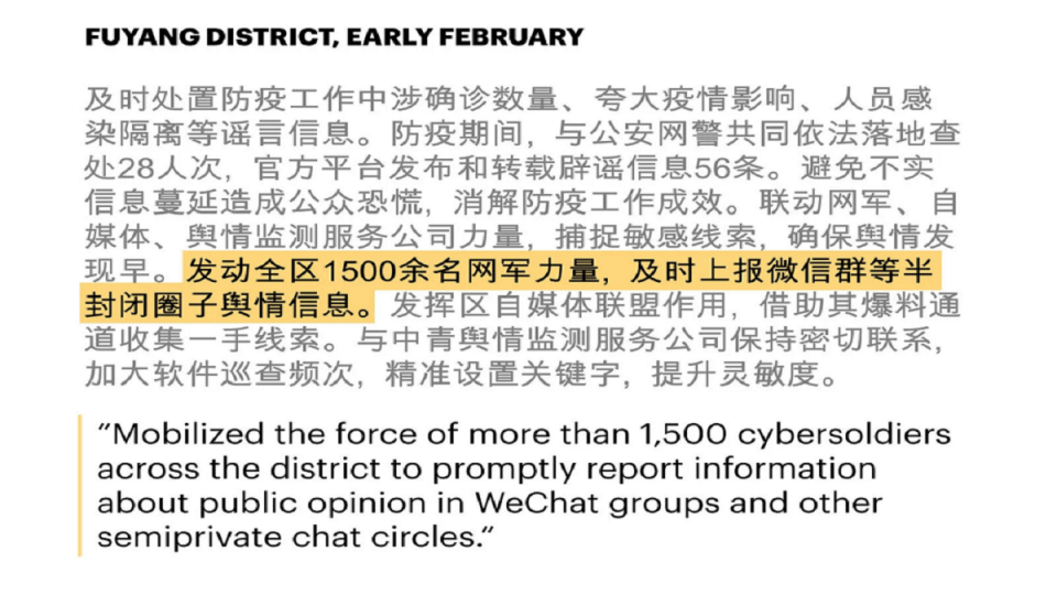 Officials in one district reported that workers in their employ had posted online comments that were read more than 40,000 times, “effectively eliminating city residents’ panic.” Workers in another county boasted of their “severe crackdown” on what they called rumors: 16 people had been investigated by the police, 14 given warnings and two detained. One district said it had 1,500 “cybersoldiers” monitoring closed chat groups on WeChat, the popular social app.