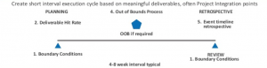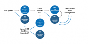 The Out-of-Bounds review occurs when the team believes they will not meet the boundary conditions set out at the beginning of the project. This review follows a clear communication path and escalation plan to quickly establish new boundary conditions, and get the team headed once more toward its goal, with only minimal interference from management. This review is a blame-free way to respond creatively to a break in the boundary conditions. The focus is on making the best decision for your company — which may include cancelling the project.