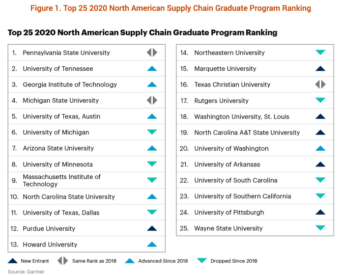 The somewhat surprising news: the undergraduate program in supply chain from the University of Arkansas topped the list, supplanting long term number 1 Penn State for the leadership spot. (See Gartner Names Top University Undergraduate Supply Chain Programs for 2020.)