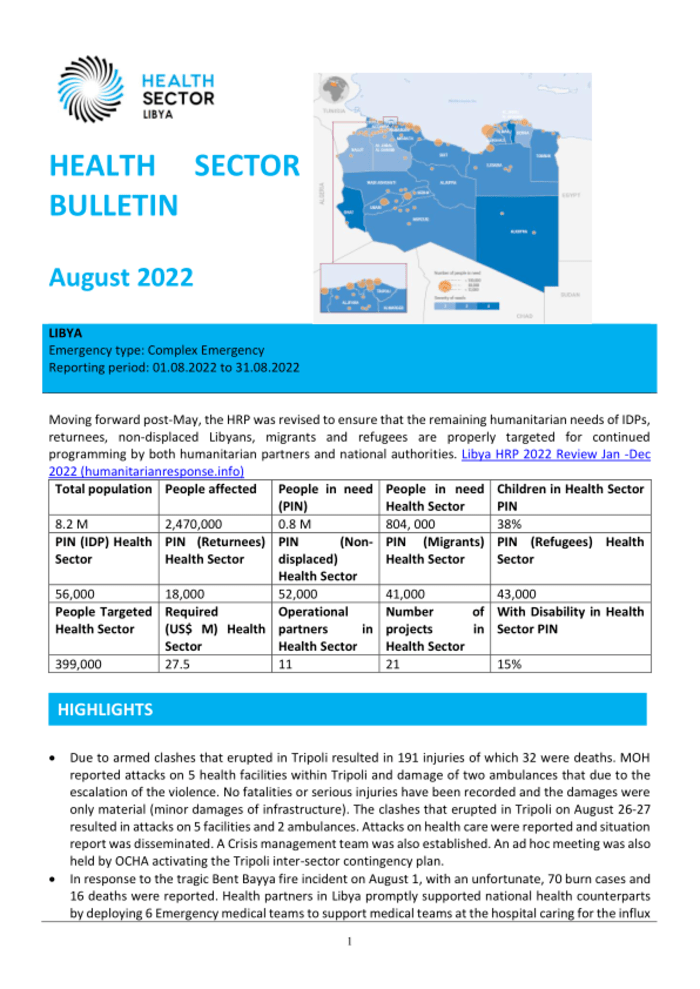 • In response to the tragic Bent Bayya fire incident on August 1, with an unfortunate, 70 burn cases and 16 deaths were reported. Health partners in Libya promptly supported national health counterparts by deploying 6 Emergency medical teams to support medical teams at the hospital caring for the influx of cases and provided support of medical supplies to hospitals receiving cases in Benghazi, Sebha and Tripoli • Health Sector Operational Response for August 2022 has been published. 4W health sector, August 2022 | HumanitarianResponse • The health sector operational response report was based on the 4Ws data for July 2022. Thirteen health partners reported to 4Ws in July, including AAH, HI, IMC, IOM, IRC, MSF, IMC, PUI, UNHCR and WHO. Microsoft Power BI • Three weekly and one monthly Epidemiological bulletin published COVID-19 EPI Weekly Libya 21 Aug 2022 | HumanitarianResponse • Published biweekly health sector operational update Bi-weekly operational update 1-15 August 2022 | HumanitarianResponse • OCHA Libya l Humanitarian Bulletin (April – June 2022) [EN/AR] – Libya | ReliefWeb • Access update: Libya: Humanitarian Access Snapshot (January – June 2022) – Libya | ReliefWeb • Libya — Migrant Report 42 (May – June 2022) | DTM (iom.int)