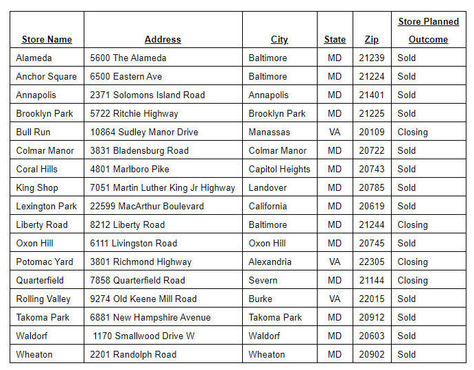 Below is a list of current Shoppers Food stores that have been sold or will close.