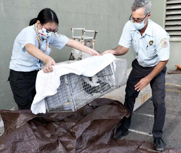 DOA Plant Quarantine Inspectors Matthew Olbert and Erika Magarifuji were able to lure the skunk into the cage. Although the animals are known for spraying a foul scent, this one kept its olfactory defenses on hold as Olbert and Magarifuji partially covered the cage with a towel, placed it on a plastic tarp and carefully loaded it into the bed of their truck.