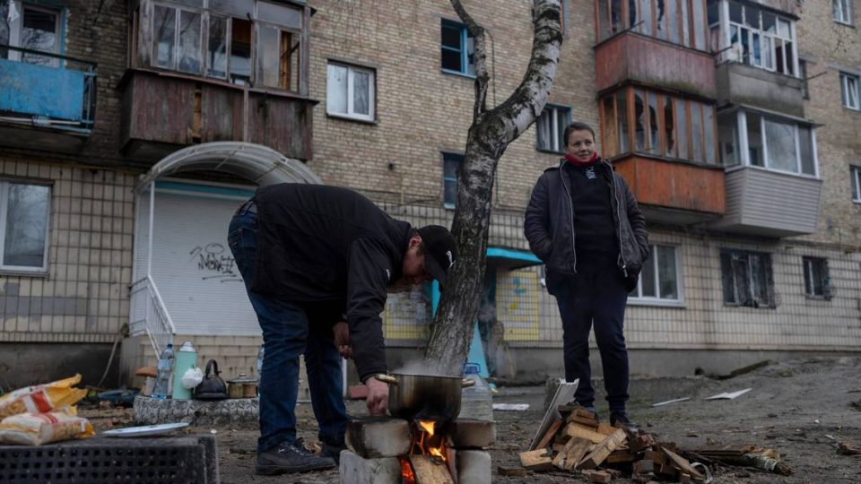 Oleksander Radkevich, 41, cooks on a makeshift fire next to his wife Irina Shekhovtsova outside their destroyed apartment building in the town of Borodyanka, Ukraine, on Saturday, April 9, 2022. Russian troops occupied the town of Borodyanka for weeks. Several apartment buildings were destroyed during fighting between the Russian troops and the Ukrainian forces in the town around 40 miles northwest of Kiev. (AP Photo/Petros Giannakouris)