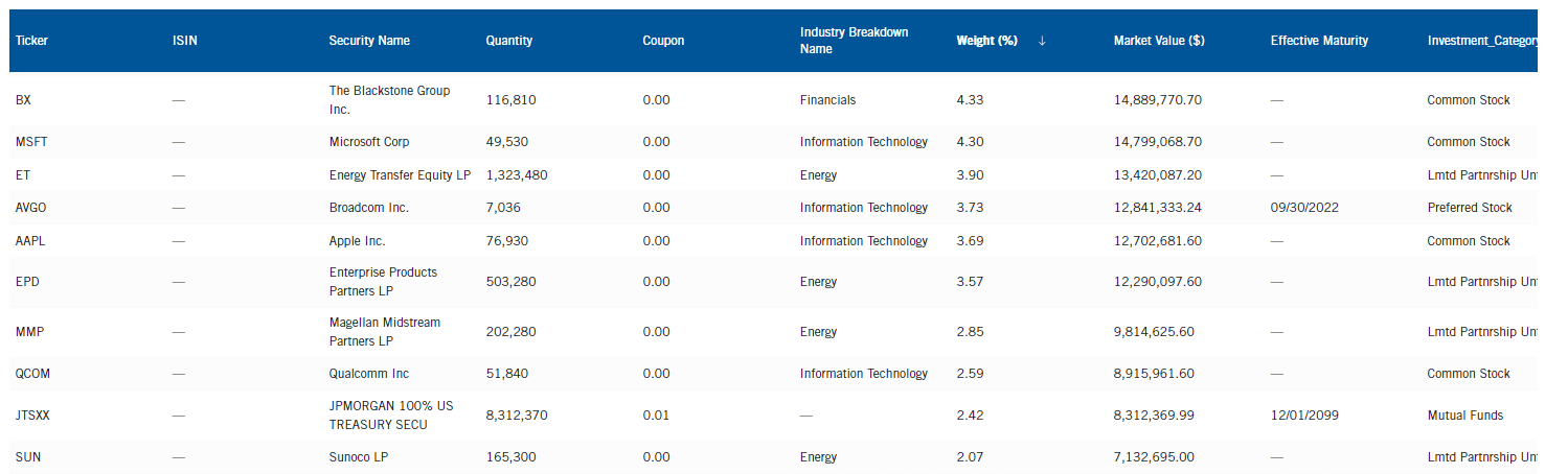 The fund is a bit smaller, which could mean a lack of liquidity for larger investors. They utilize a moderate amount of leverage, which seems prudent given the underlying tech and MLP exposure that can cause quite a bit of volatility.