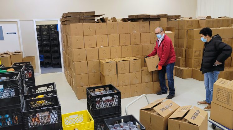 Food hampers on pallets being brought in to the local food bank at the Salvation Army. [Photo: Gerry Lampow 106.1 The Goat/Vista Radio]