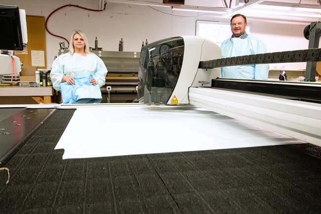 Nadia Kifyak and Russ Monk, managers at WaterShed, Inc., try on new medical gowns that their company has recently begun producing in response to the shortage of personal protective equipment. (Caleb Wolf/Salem Reporter)