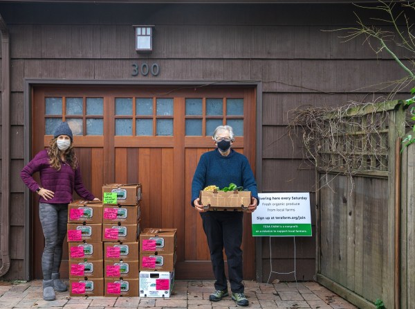 Menlo Park residents Lindsey Hutchinson and Mark Tuschman are volunteering to help local small farmers bring fresh organic produce to the community. They are the Menlo Park site hosts for the nonprofit Tera Farm, offering their driveways as a drop-off site for farmers each Saturday.