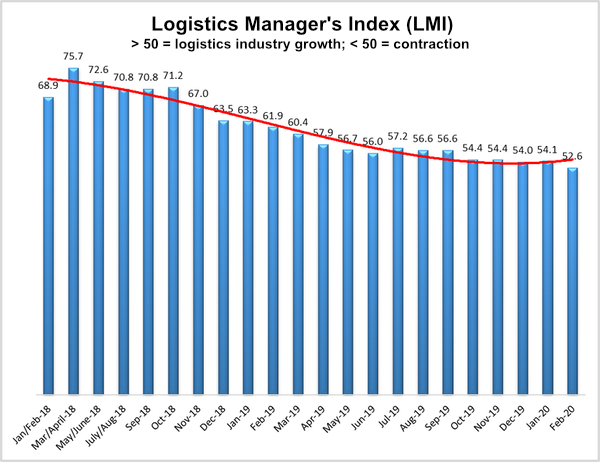 The LMI slowed to a reading of 52.6, down 1.5 percentage points compared to January and down more than 10 percentage points compared to February 2019. Despite the slowing, the LMI remained in growth territory. An LMI reading above 50 indicates growth in the logistics sector; a reading below 50 indicates contraction.