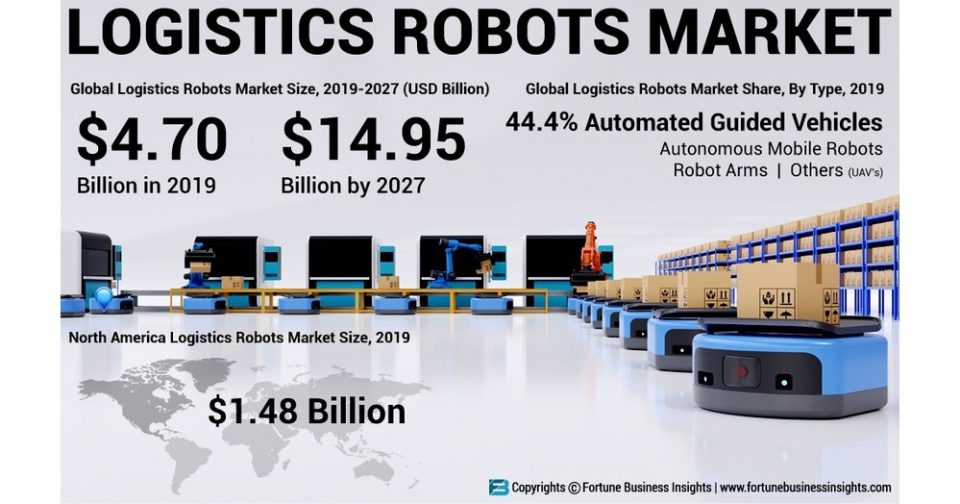 PUNE, India, June 10, 2020 /PRNewswire/ — The global logistics robots market size is prophesied to reach USD 14.95 billion by the end of 2027. The growth of this region is attributed to the increasing demand for complex supply-chain operations. Logistics robots are autonomous devices that can transport resources present in a logistic network. They store and move goods that are widely used in storage facilities and warehouses. According to a recent report by Fortune Business Insights titled, “Logistics Robots Market Size, Share & Industry Analysis, By Type (Automated Guided Vehicles, Autonomous Mobile Robots, Robot Arms and Others), By Application (Palletizing & De-palletizing, Pick & Place, Transportation, and Others), By Industry (E-commerce, Healthcare, Retail, Food & Beverages, Automotive and Others), and Regional Forecast, 2020-2027,“ the market value was USD 4.70 billion in 2019 and is expected to rise at a CAGR of 15.7% between 2020 and 2027.