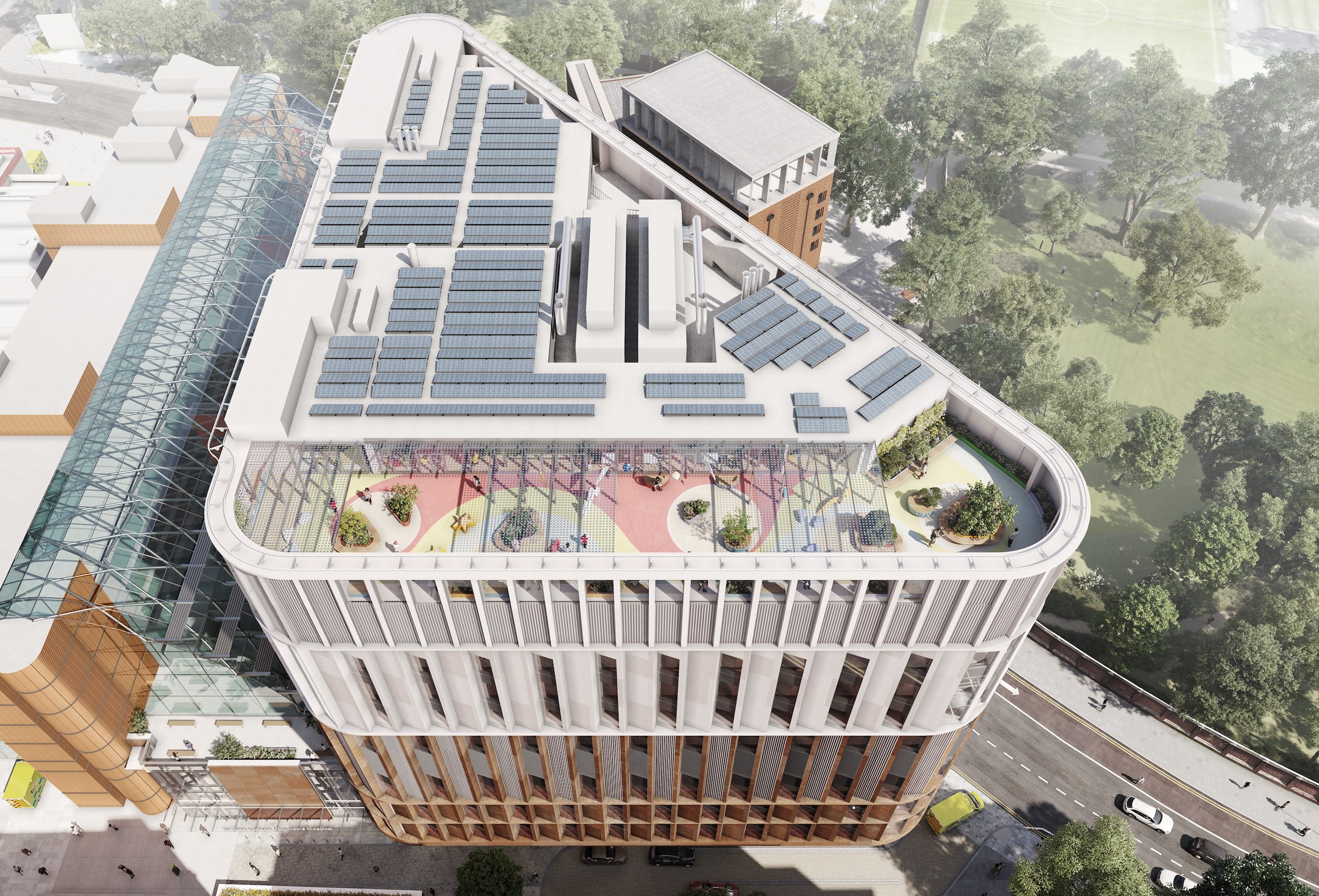 New extension will house 100 beds, operating theatres and spaces for patients to relax, including a roof terrace.