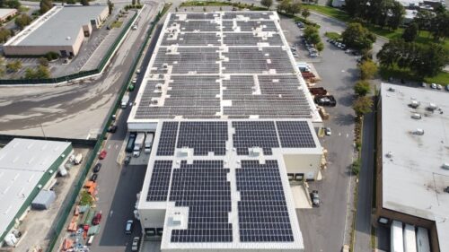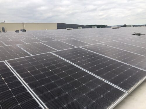 The array is composed of LG 405-W and 400-W modules paired with Solectria PVI TL string inverters in 60-, 50- and 36-kW models each rated at 480 V. The racking used on the TPO roofing is the TGR ballasted system from TerraGen Solar. The standing seam section used TerraGen’s TGP flush mount paired with S-5! clamps.